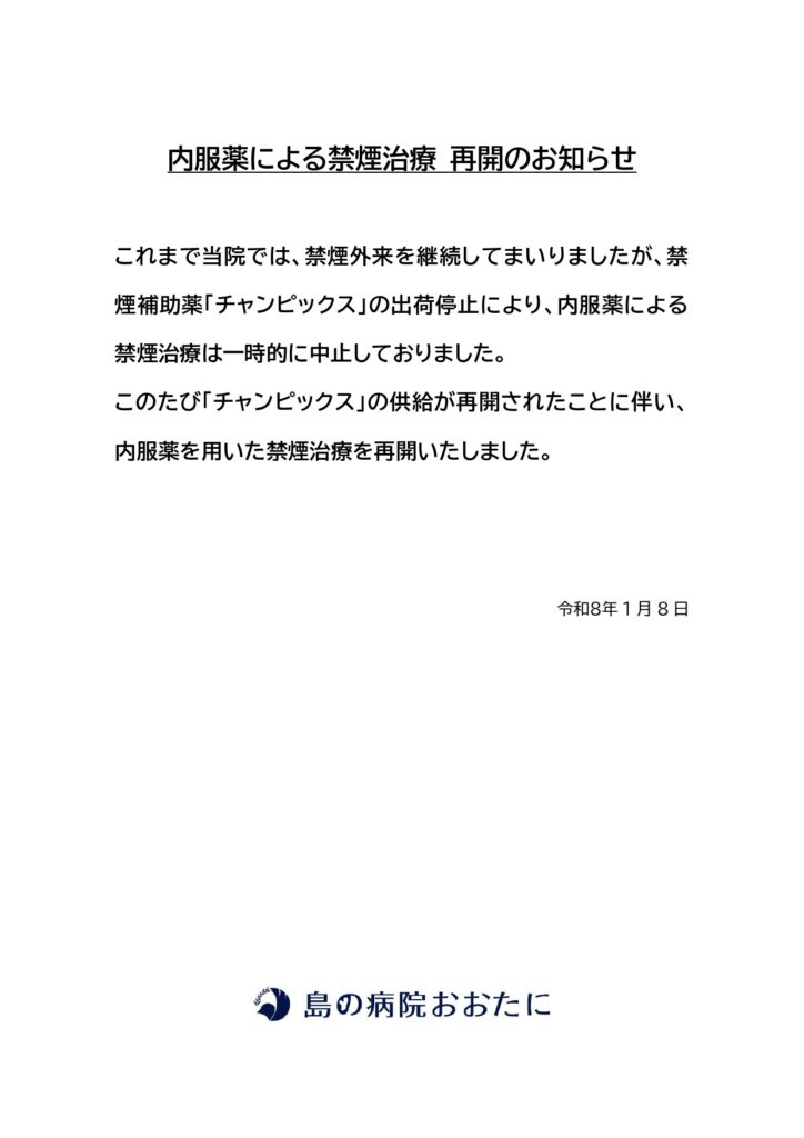 内服薬による禁煙治療・再開のお知らせ