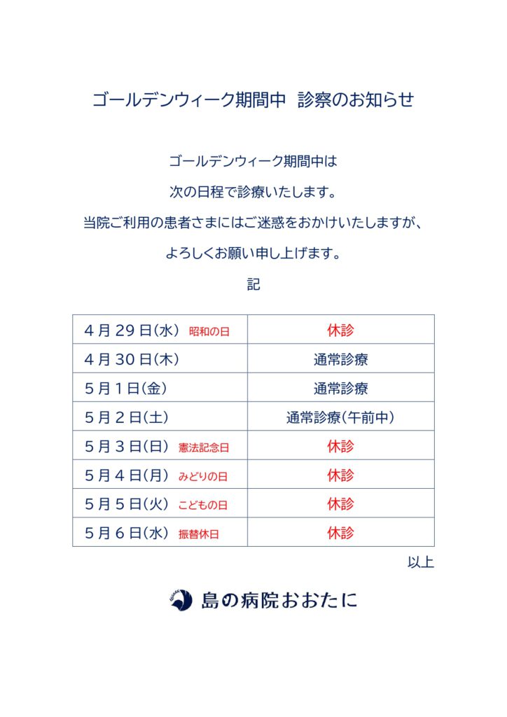ゴールデンウィーク期間中の診察について