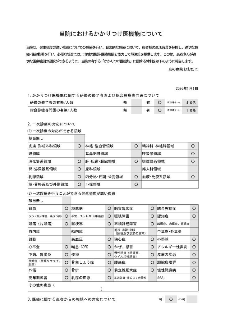 2026年02月20日患者・一般 「当院におけるかかりつけ医機能について」を追加しました ※広島県のホームページにある医療機関の検索はこちらをご覧ください 当院は地域の介護保険施設等の協力医療機関として連携体制を構築しています。